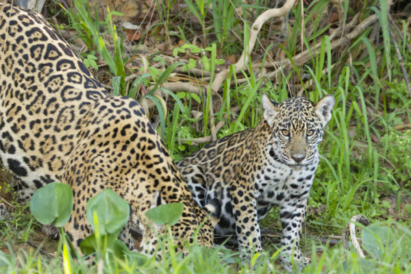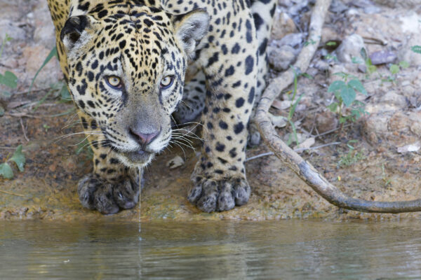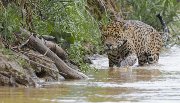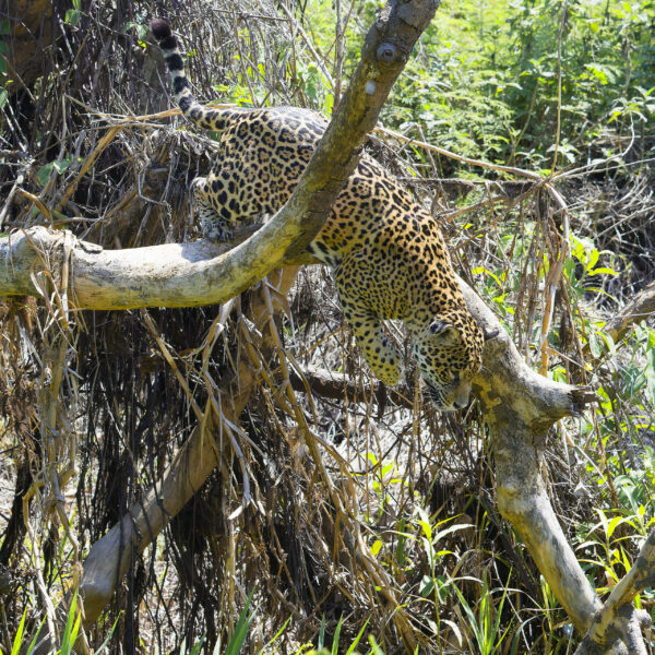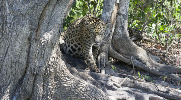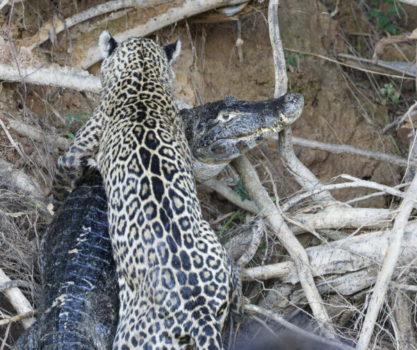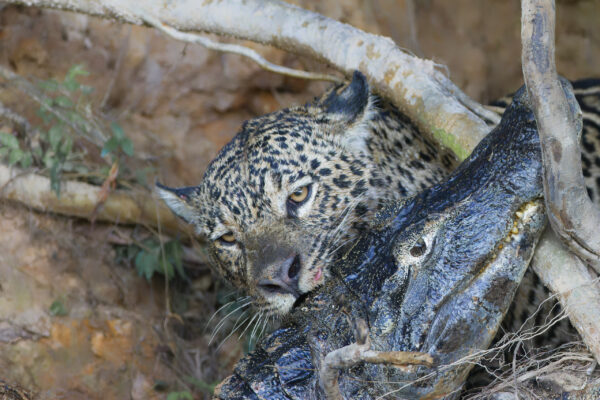 Pantanal jaguars eat caimans. They often hunt them from a tree or an elevated position.
